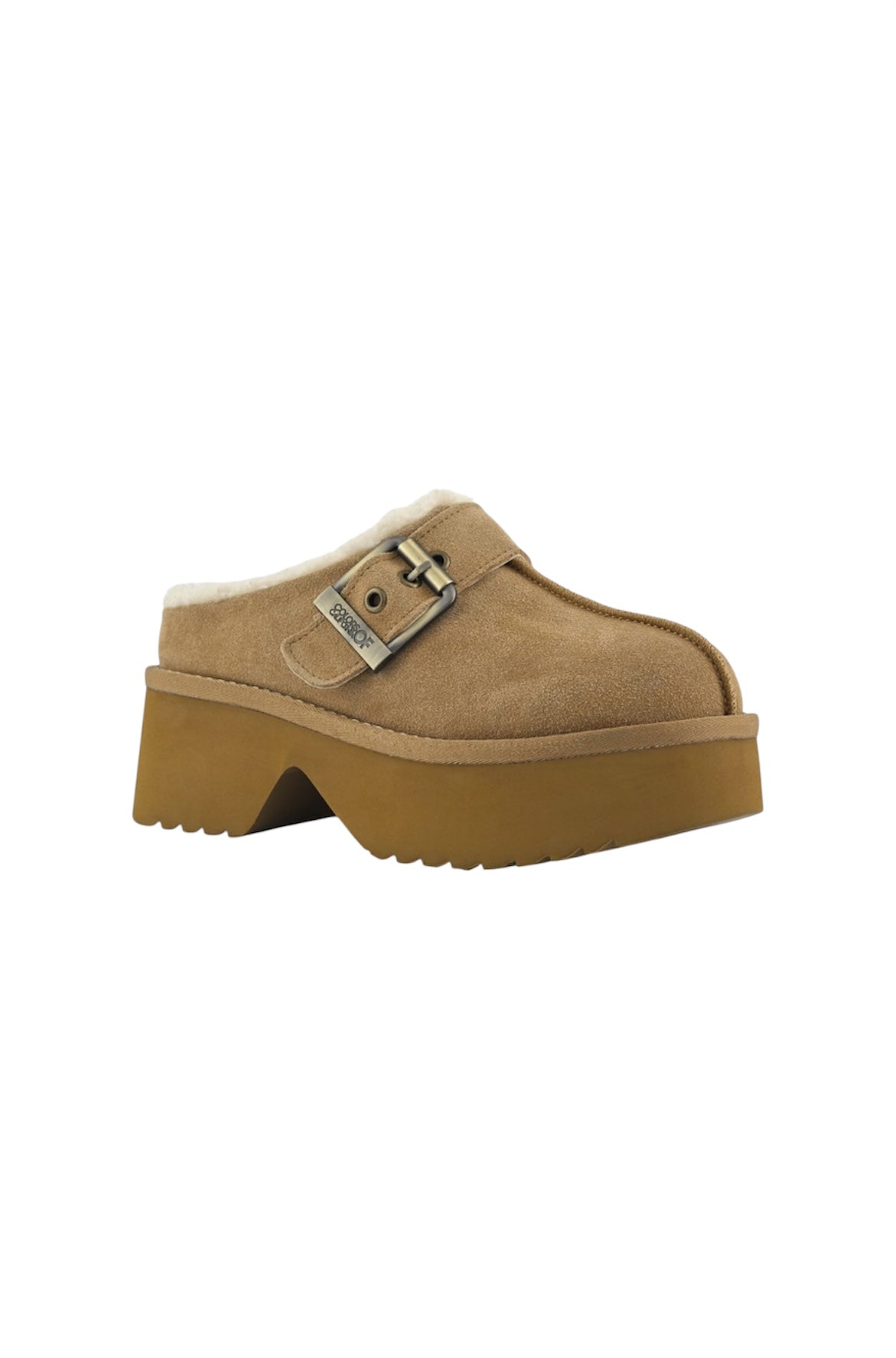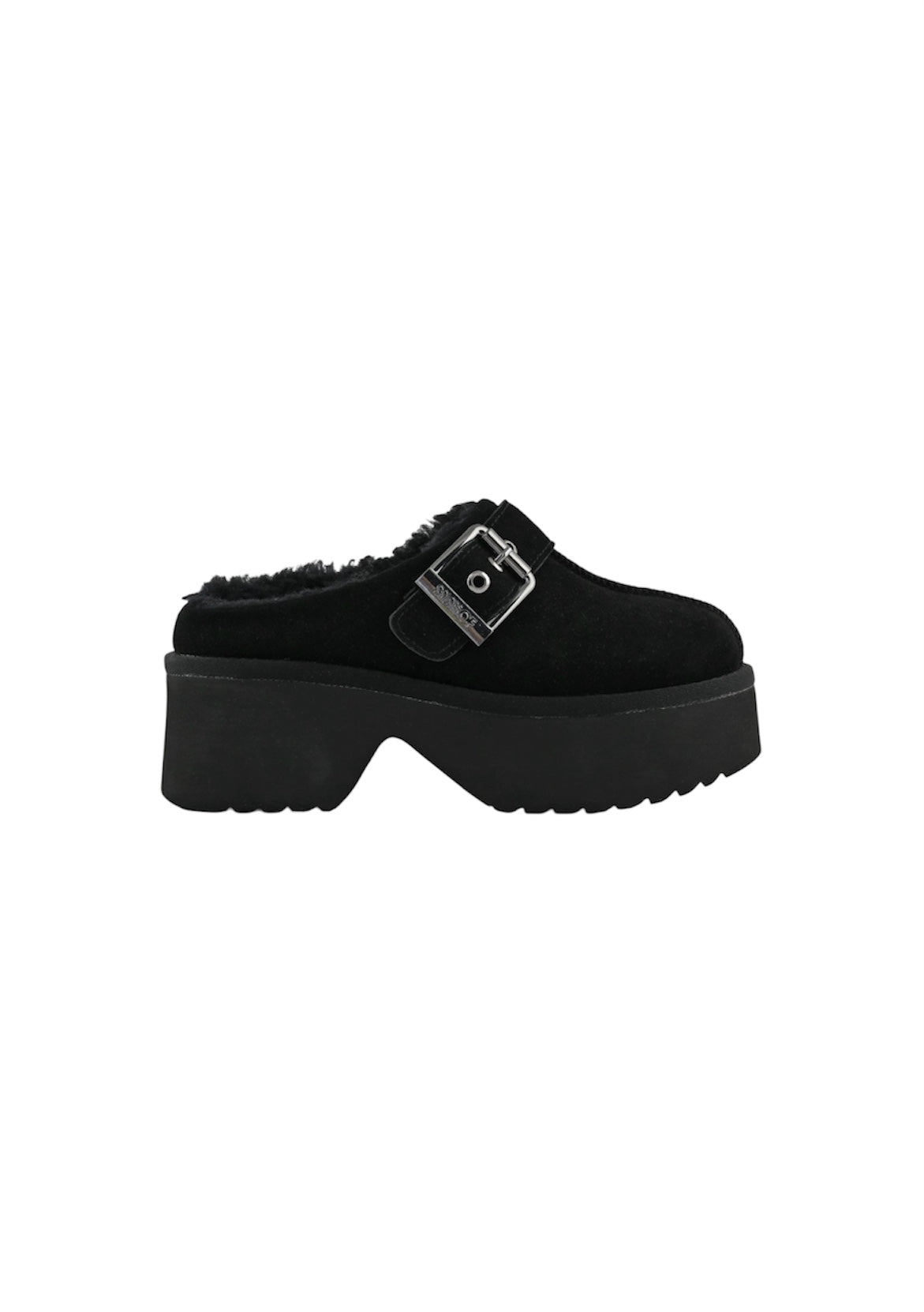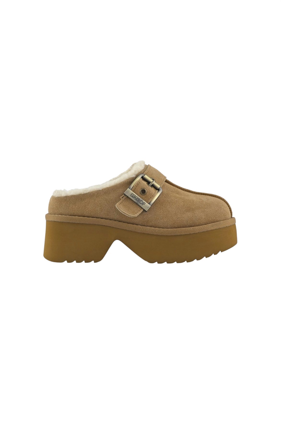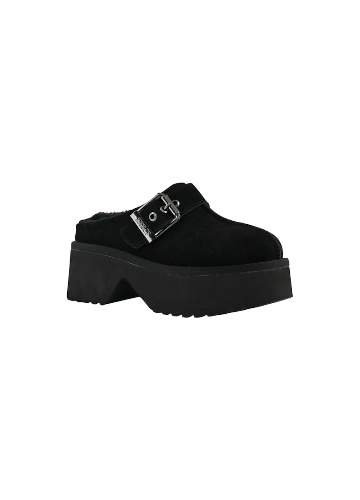Il sabot in pelle scamosciata nella sua versione più glamour ha una suola plateau e un'elegante fibbietta in metallo nella parte superiore della tomaia. Lunghi abiti in chiffon a stampa floreale o pantaloni bootcut donano un tocco hippy a questo modello che strizza l'occhio allo stile coachella, tanto amato dalle donne di tutte le età.