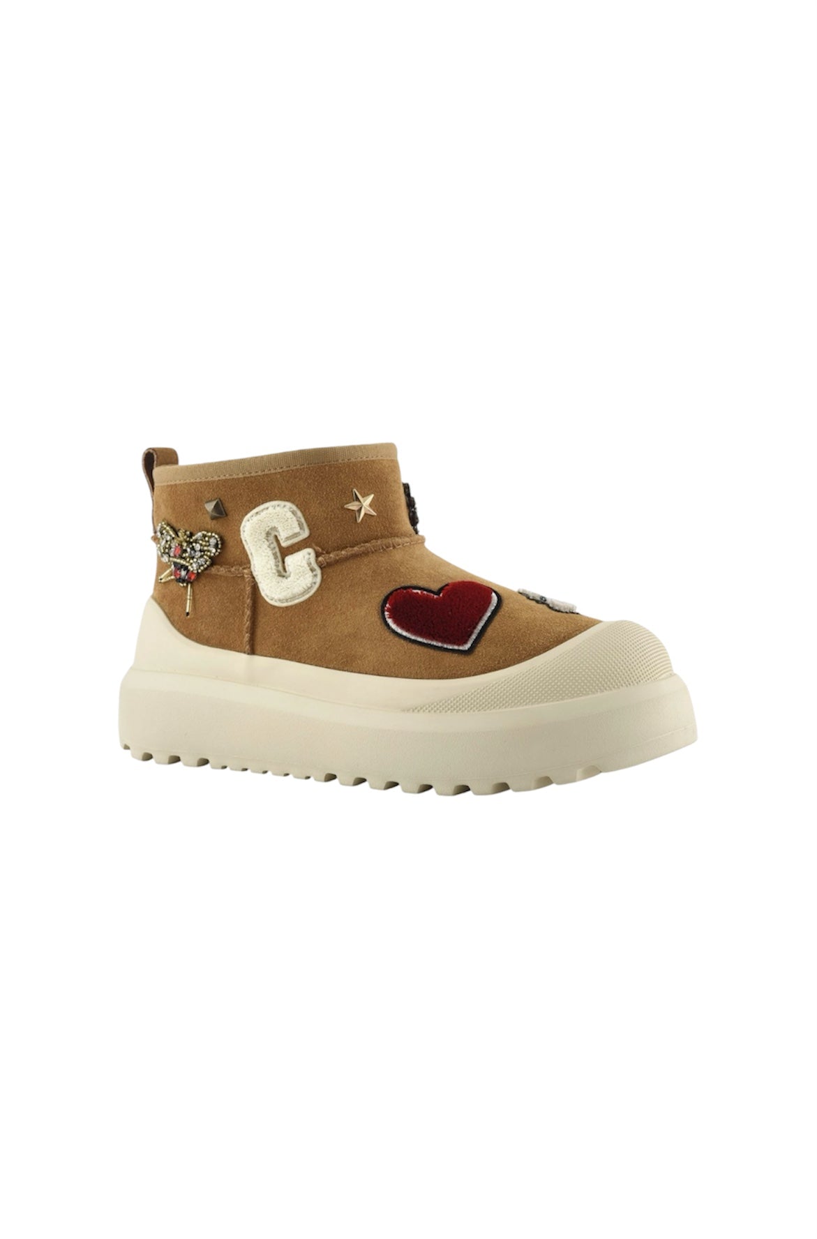 Una fusione divertente e originale, quella che fa di questa sneker con maxi suola un simpaticissimo stivaletto invernale in pelle scamosciata. I patches applicati poi, giocosi e coloratissimi, danno un tocco trendy di ispirazione eighties. L'abbinamento ideale li vuole con completo in morbido cachemire e maxi cappotto o eco pelliccia con colori a contrasto.