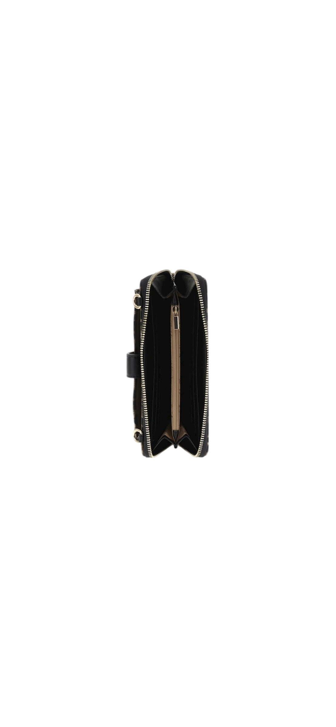Portafoglio effetto pelle stampa leopardo chiuso con zip interno con portacarte e tramezza con zip tasca esterna per cellulare e tracollina removibile.