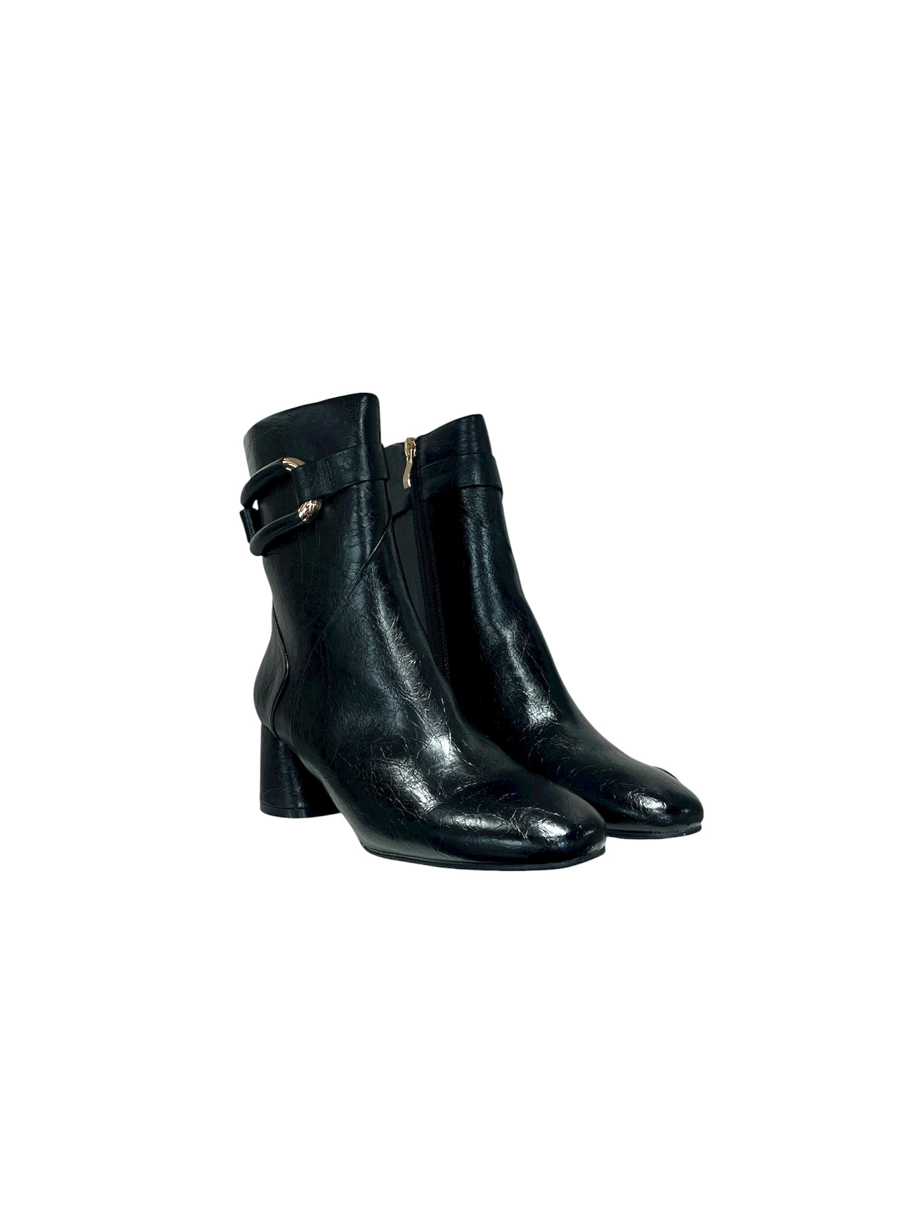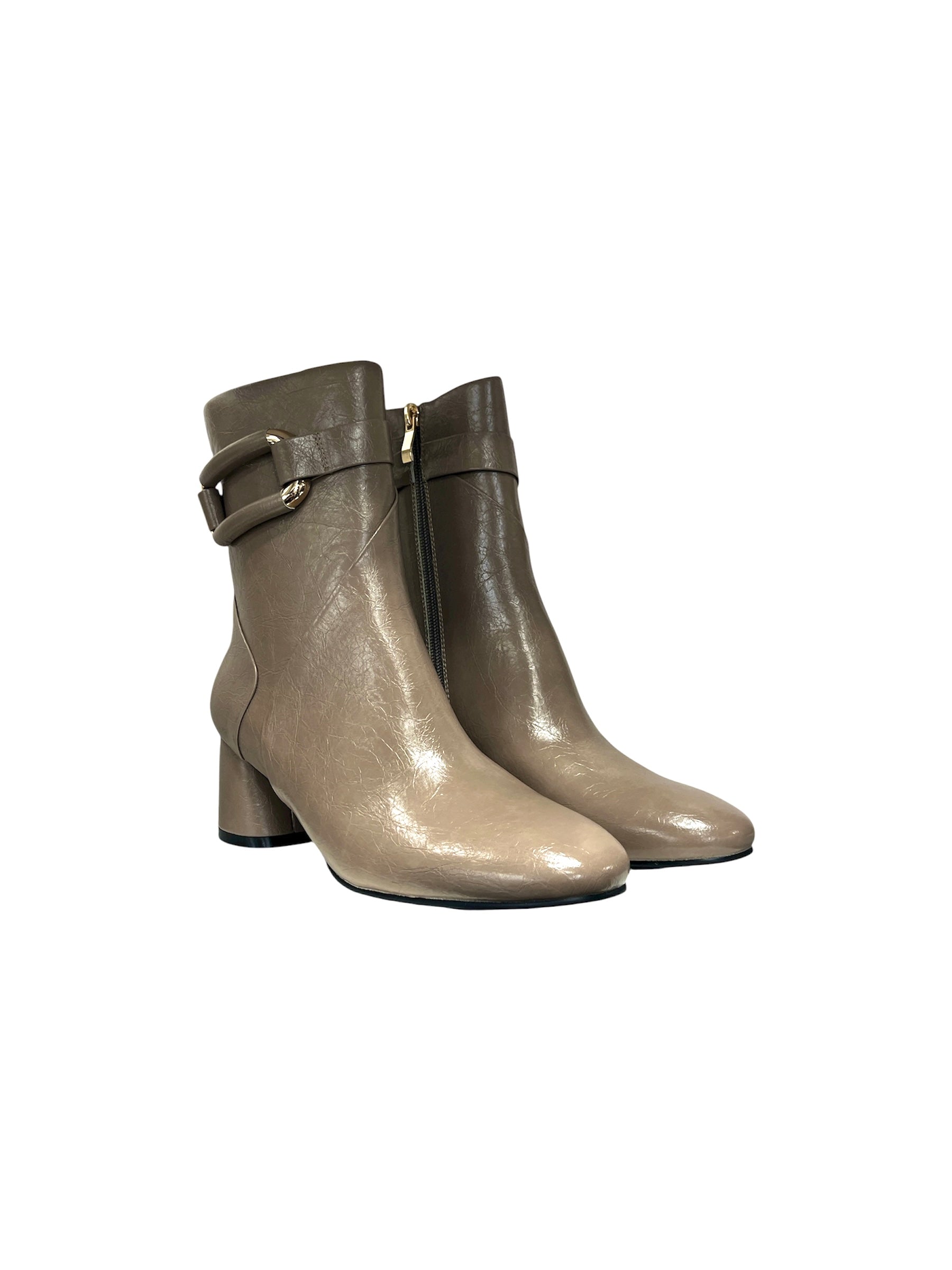 Un design raffinato caratterizza questi tronchetti a punta tonda,con morsetto tono su tono,chiusura con cerniera,realizzati in ecopelle.