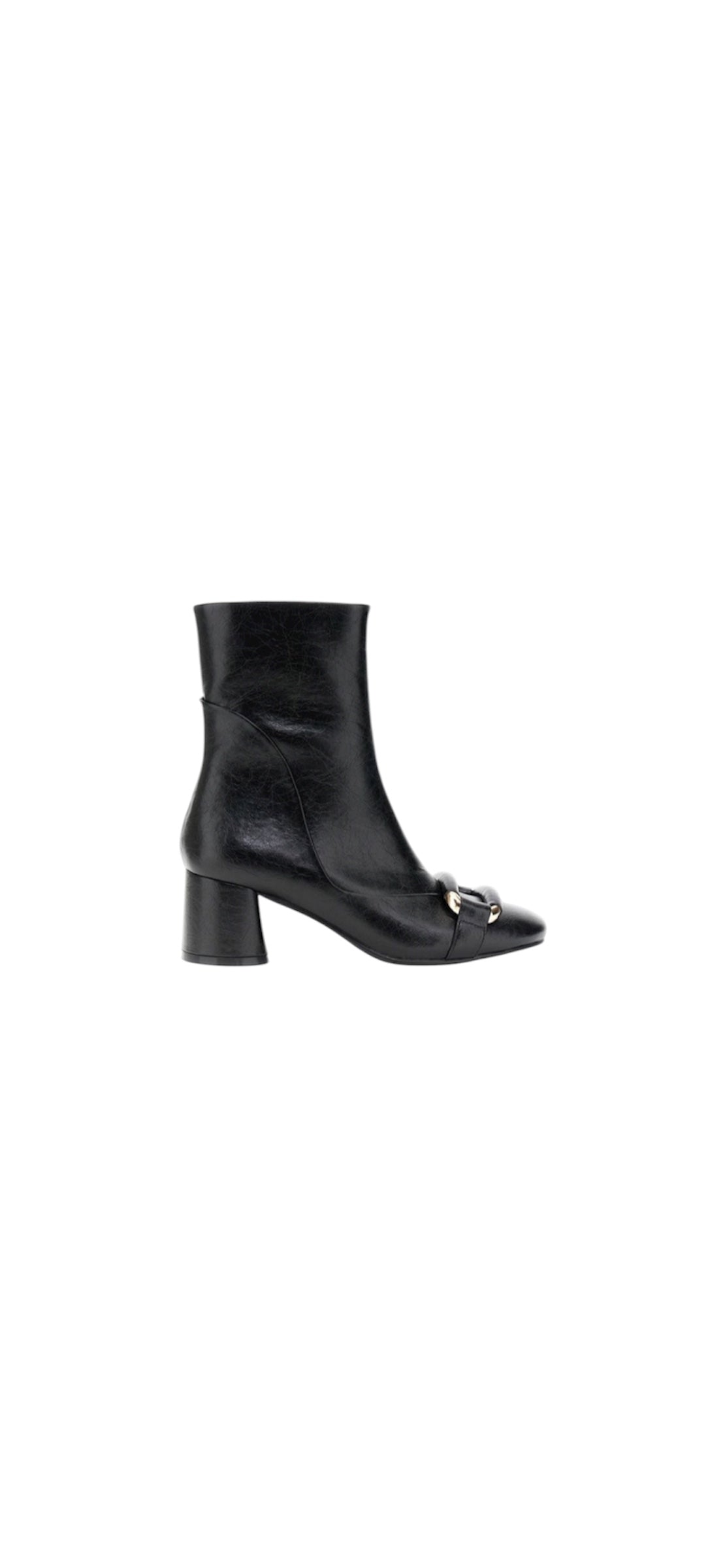 Un design raffinato caratterizza questi tronchetti a punta tonda, con morsetto tono su tono,chiusura con cerniera,realizzati in ecopelle.